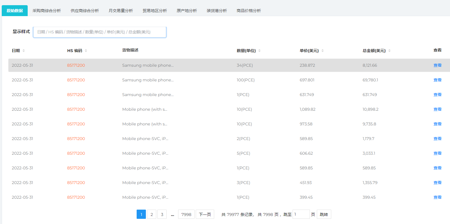 以手机这个产品举例,查询之后的结果如下,显示了越南每一笔手机进口的海关报关记录: