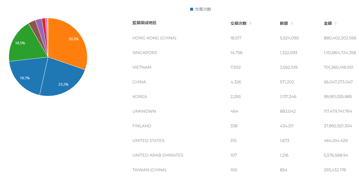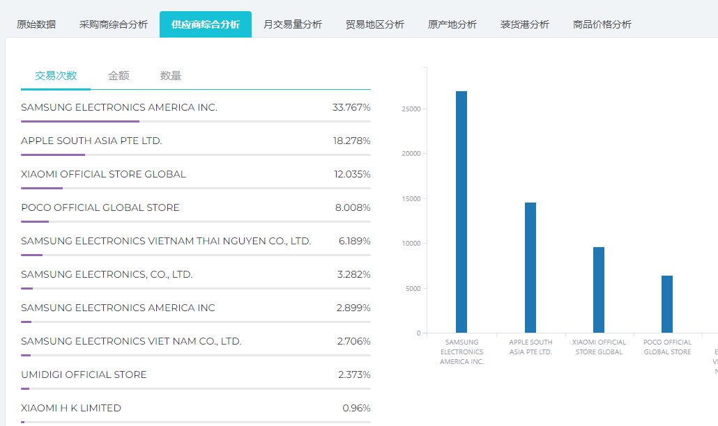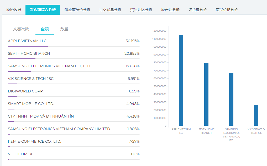 点击供应商综合分析,可以看到手机这个产品全球销往越南的供应商的汇总分析,同样很方便了解越南的全球采购供应链: