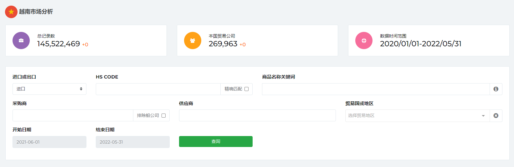 越南海关数据可根据HS编码、商品描述、采购商、供应商、贸易地区、报关日期范围等条件单独或组合查询: