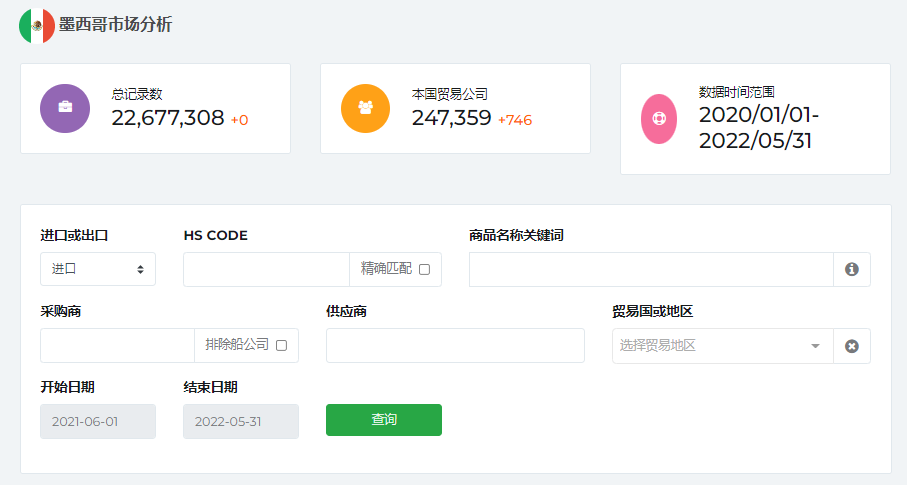 纽佰德海关数据系统中墨西哥海关数据查用来查询的条件有:HS编码、商品名称、采购商、供应商、贸易国或地区、开始日期、结束日期。