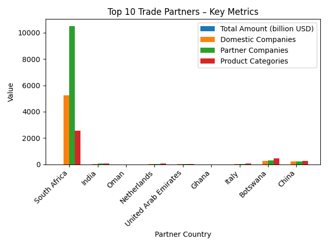 其余伙伴国(阿联酋、加纳、意大利、博茨瓦纳、中国)合计贡献约0.41亿美元,涉及商品种类共计1,059种,供应商和采购商数量也体现了中小型多元贸易网络的活跃度。