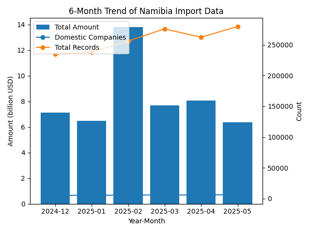 从2024年12月至2025年5月,纳米比亚进口总金额呈现先降后升再回落的态势。2024年12月进口金额为7.11亿美元,活跃进口企业5,294家,记录235,064条;2025年1月进一步下滑至6.50亿美元,企业数5,057家,记录238,197条;2月受季节性需求刺激,激增至13.82亿美元,对应5,682家企业和256,247条记录;3月回落至7.70亿美元,但企业数升至5,712家,记录276,063条;4月小幅回升至8.07亿美元,企业数5,658家,记录262,428条;5月再次回落至6.37亿美元,企业数反而攀升至6,298家,记录279,945条,显示尽管总额下降,但市场参与者更趋多元。