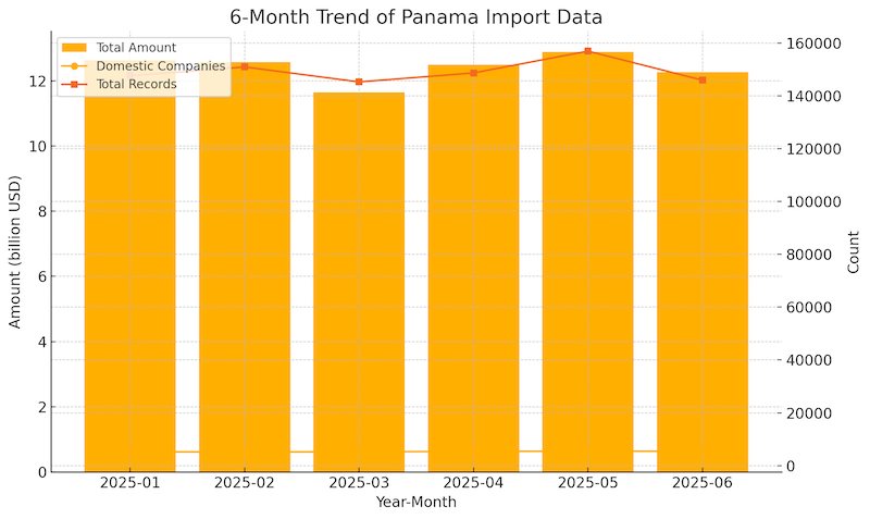 巴拿马2025年6月进口数据出炉,单月总额达122.6亿美元,较5月的128.8亿美元环比下降4.82%。本月共记录145,966条进口交易信息,显示出市场在高位运行后的阶段性回落态势。尽管整体金额有所下滑,但主要贸易通道维持稳定,特别是来自美国与中国的进口持续占据主导地位。