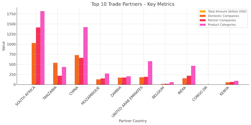 坦桑尼亚紧随其后,以0.50亿美元的进口额排名第二。尽管供应商数量为218家,低于南非,但马拉维的活跃采购商高达539家,反映出中小企业对基础商品(如燃料、食品、日用品等)的强烈依赖。
